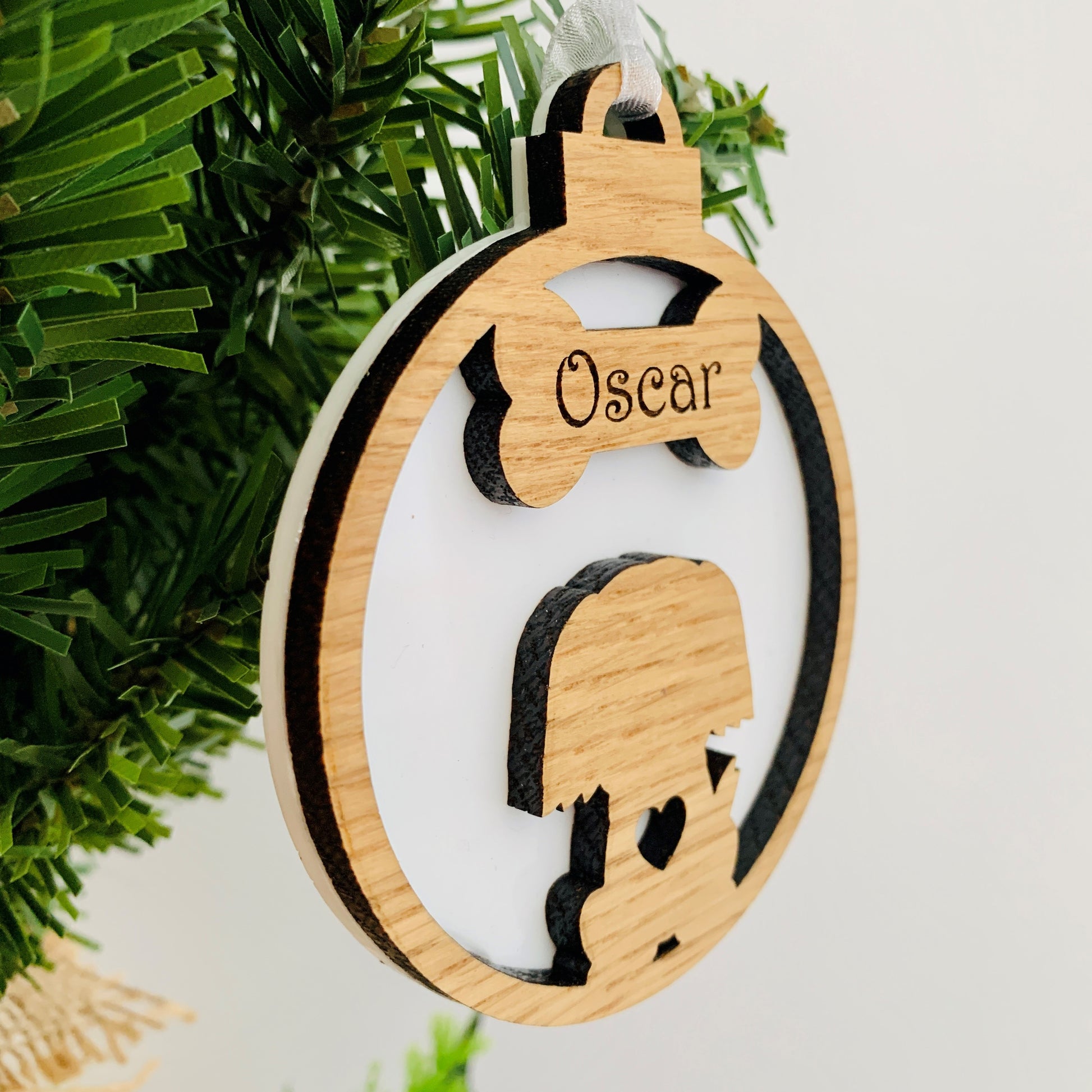 - This is a luxurious Solid Oak and White acrylic bauble, available in 17 different dog silhouettes.