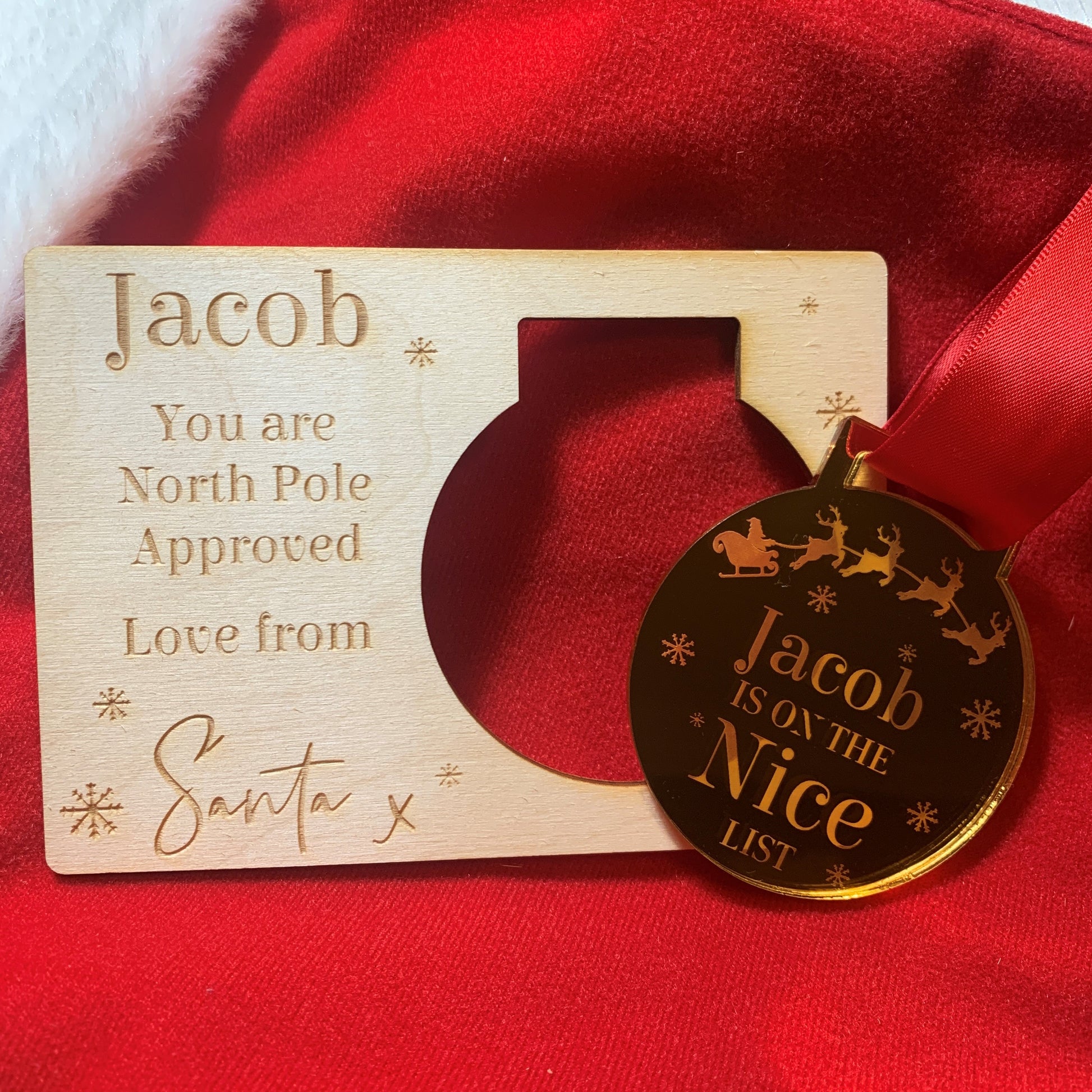 Embrace the joy and warmth of the season with our exclusive Nice List Personalised mirror finished acrylic Medal. Crafted just for your child this gleaming token celebrates kindness, spreading cheer, and embodying the true spirit of Christmas. A radiant reminder that good deeds shine brightest, making them an honorary member of Santa's cherished Nice List. Order yours today and make this festive season truly magical.