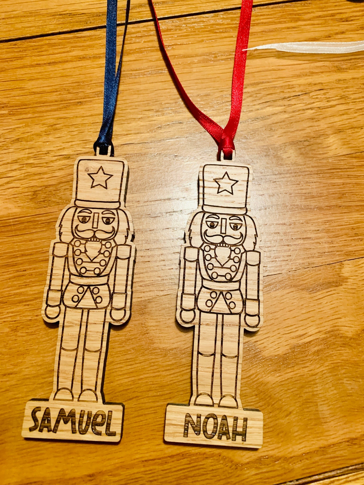 - This is a luxurious set of 2 oak baubles, engraved in our nutcracker design and personalised with names of your choice.