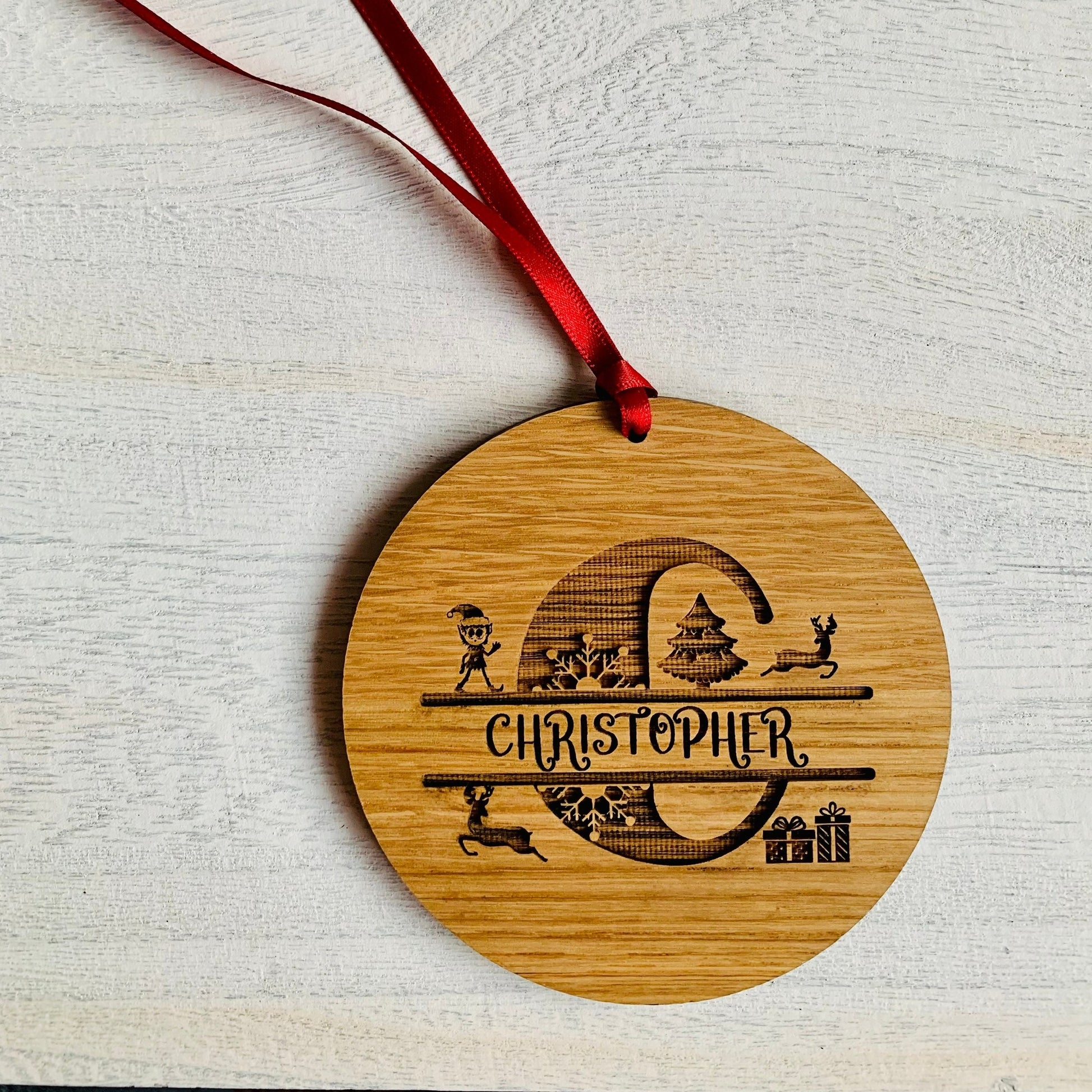 - This is a luxurious solid oak, personalised festive bauble in our Monogram Christmas design.