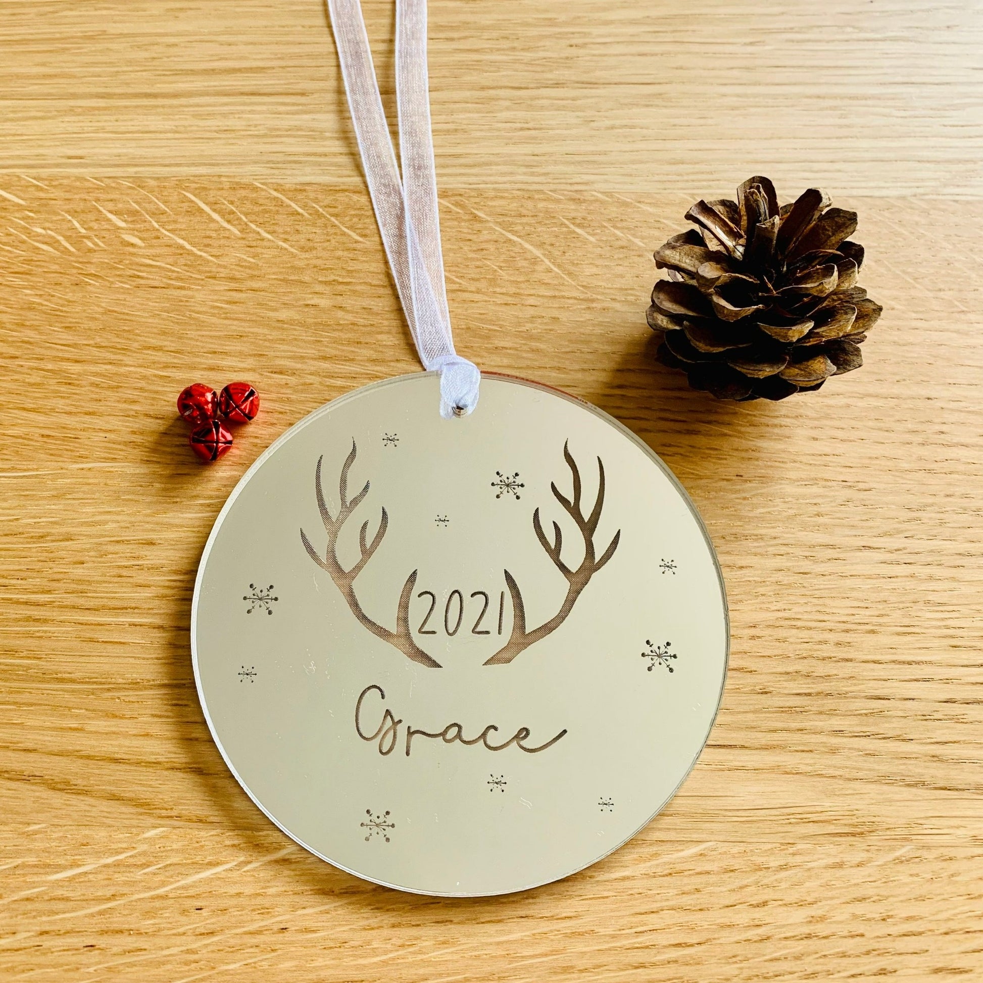 - This is a luxurious mirror finished acrylic glass bauble in our personalised Reindeer Antler design.