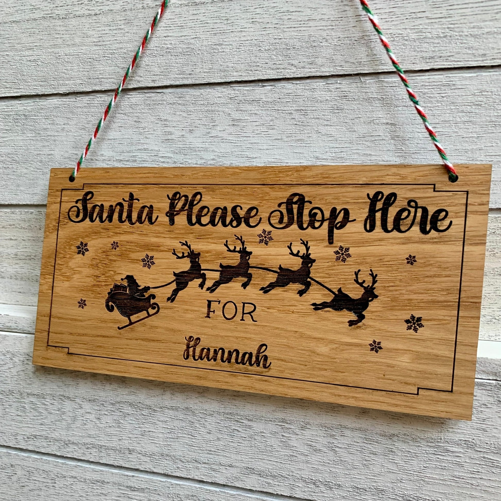 - This is a luxurious solid oak, personalised festive sign in our Santa Stop Here design.