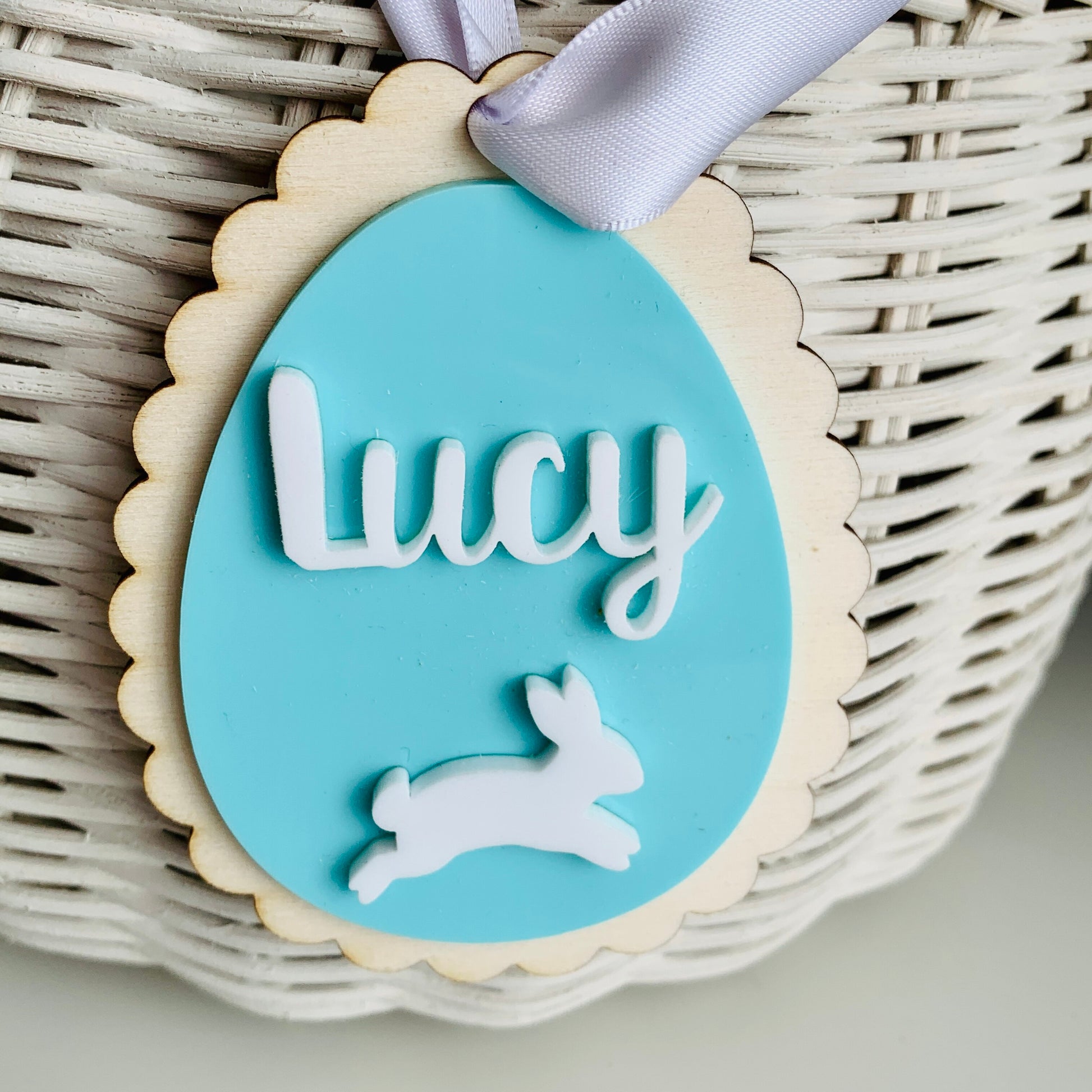 - This is a lovely personalised layered Easter Basket Tag with a white name personalisation and jumping rabbit to help you hop into Spring.