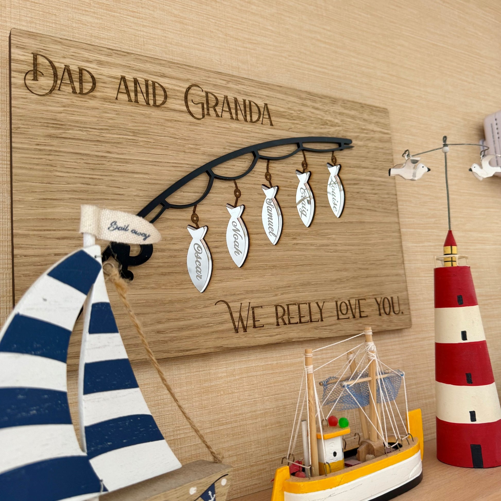 - Our 'We/I reely love you,' plaque can have any name engraved at the top and we can add as many mirrored acrylic fish as we can fit on for you.