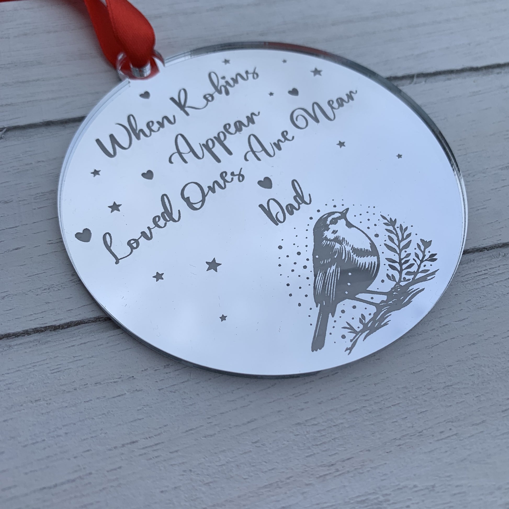 - Keep the memory of loved ones close this season with our beautifully crafted mirrored acrylic ornament, delicately engraved with a robin and your loved ones name.